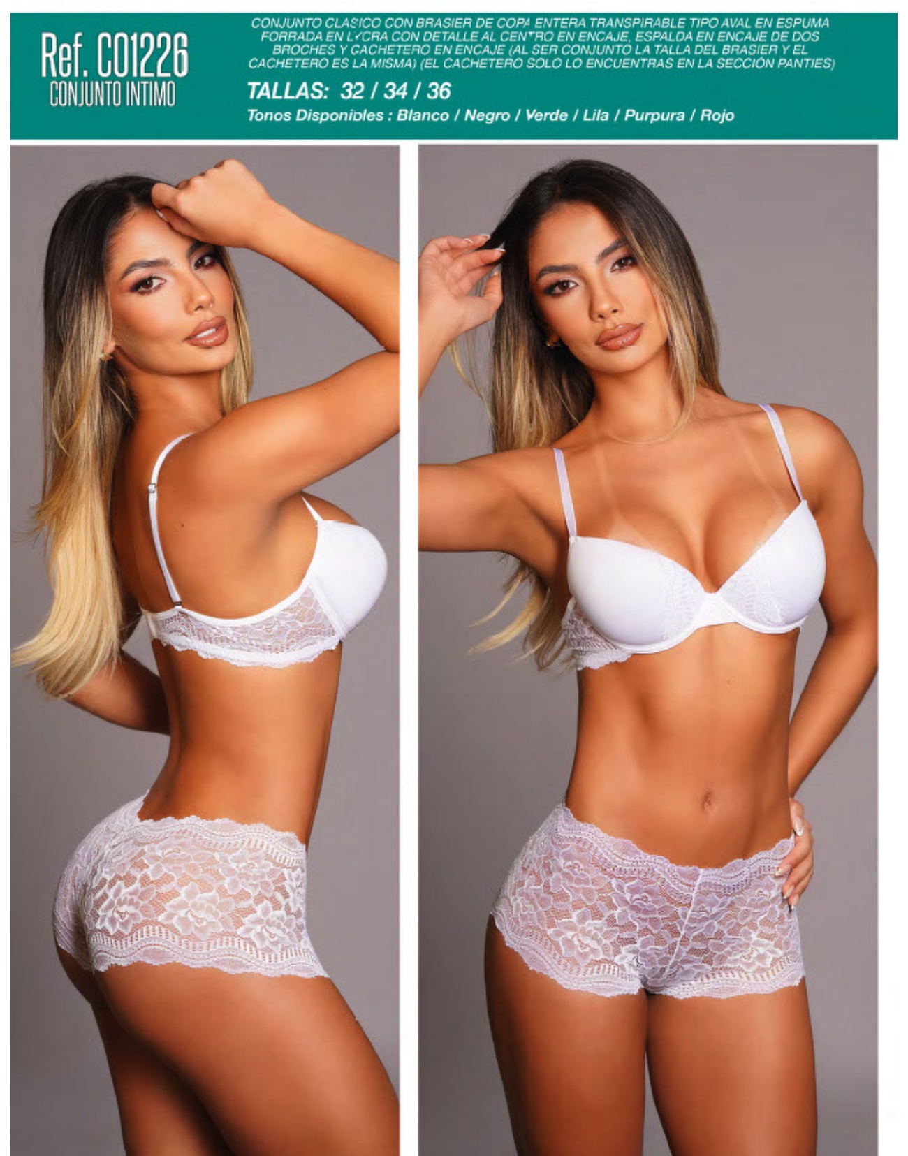 Conjunto clásico con cachetero en encaje y brasier con copa entera tipo aval en espuma forrada en lycra con detalle centrico en encaje y espalda en encaje de dos broches